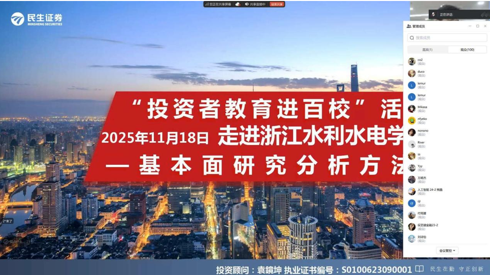 为帮助在校学生搭建金融知识体系、提升投资分析能力,2025年11月17日至21日,浙江水利水电学院经济与管理学院联合同花顺公司,共同开展“投资者教育进百校”系列线上专题讲座,邀请国联民生证券子公司民生证券的专业人士讲授。四场讲座聚焦投资领域核心知识,覆盖宏观政策、基本面分析、技术面分析、成交量解读四大维度,累计吸引超400人次参与,为经管专业学子打开了解金融市场、掌握投资方法的专业窗口。